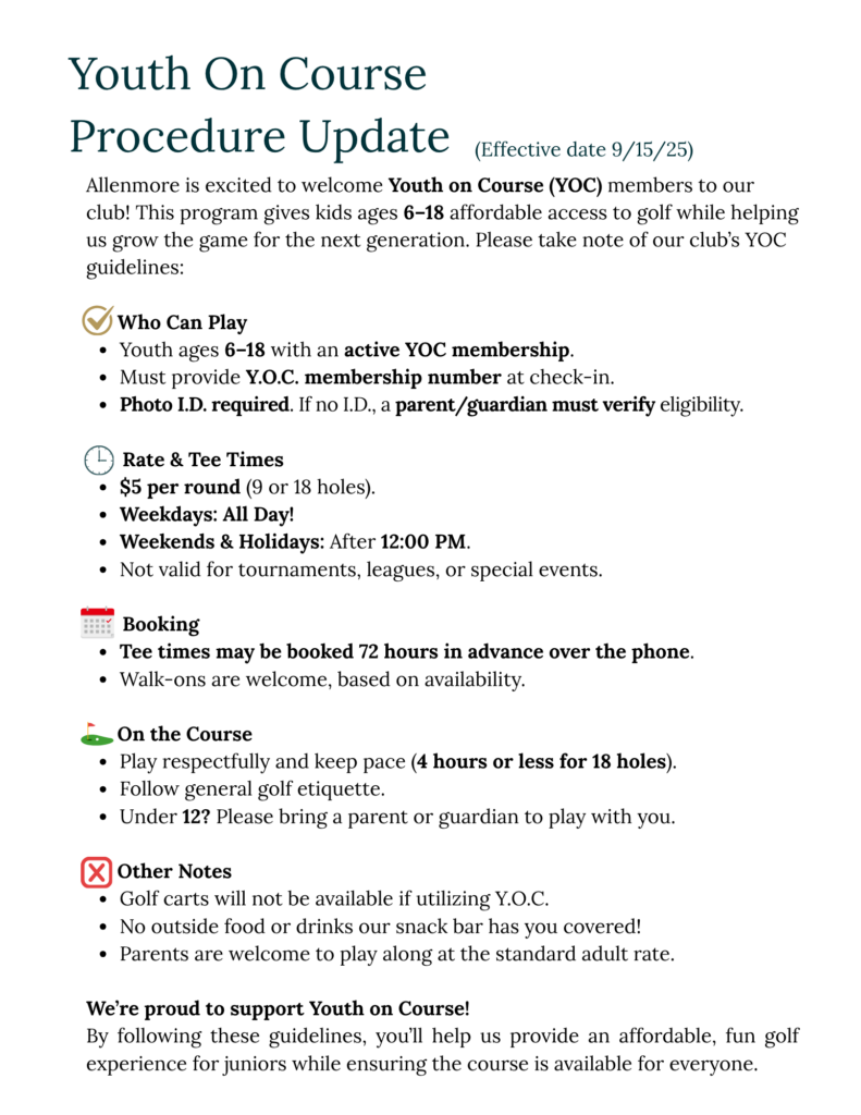 Our superintendent has implemented full cart-path-only restrictions today due to saturated turf conditions. When conditions reach this level, any cart use off the paths could cause significant course damage or create safety concerns. While Allenmore Golf Course strives to accommodate golfers with disabilities through reasonable modifications, those accommodations may be limited when course conditions present a safety risk.